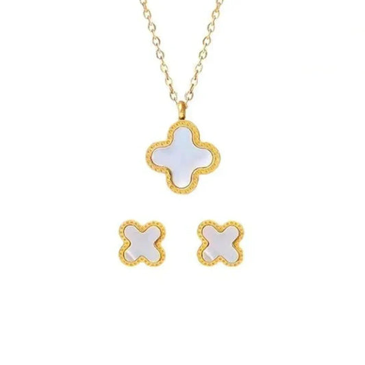 Four Leaf Clover 2 Sided Pendant With Ear Studs (White) 2Pcs Set
